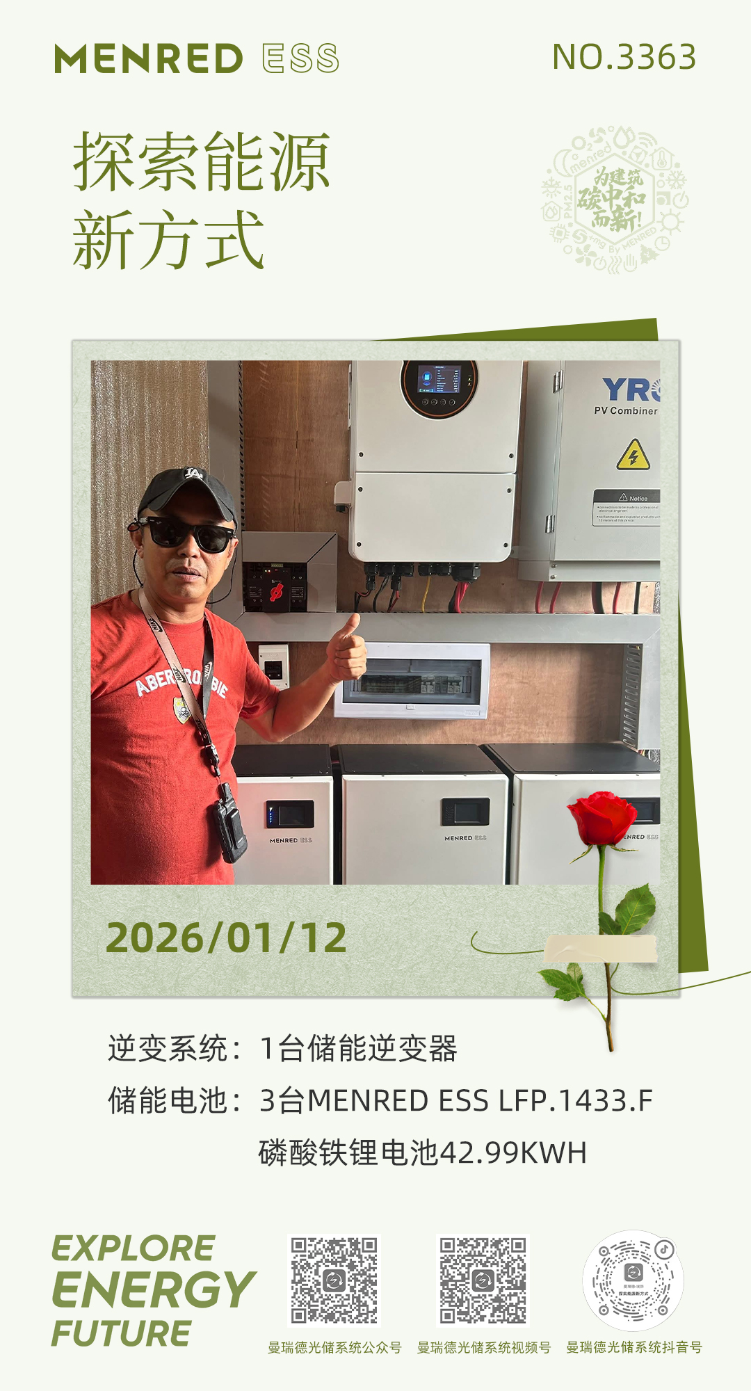 “ ” 曼瑞德光储系统,以1台逆变器和3台磷酸铁锂电池,总容量42.99KWh,为您提供...