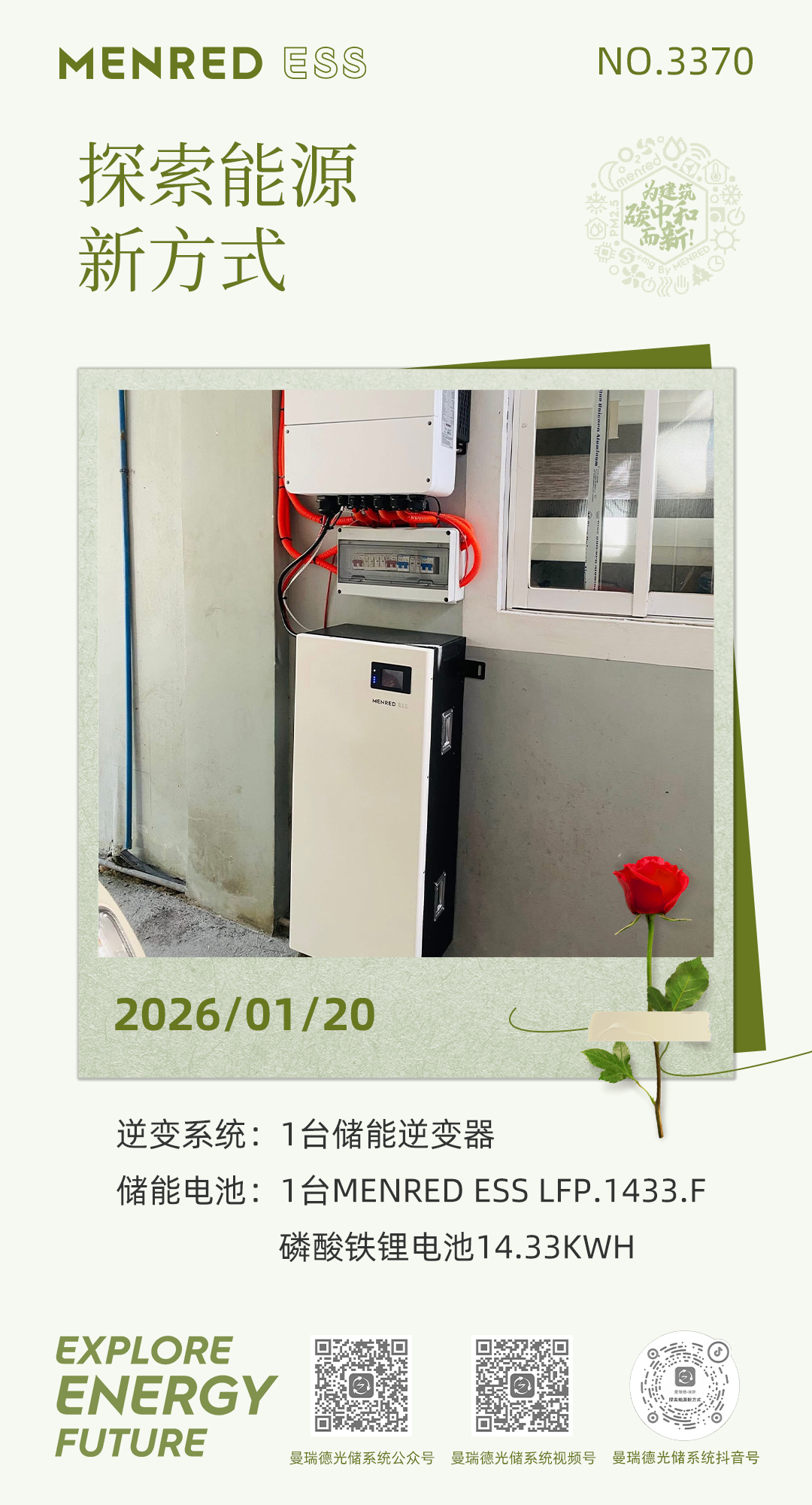 “ ” 曼瑞德光储系统,搭载1台逆变器和1台14.33KWh磷酸铁锂电池,为您的家庭提供...